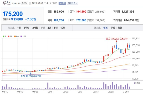 - 루닛은 2023년 6월 30일 기준 연결 매출액이 5천억원으로 전년 동기 대비 20.0% 증가하고, 영업이익이 -100억원으로 전년 동기 대비 개선되었습니다.