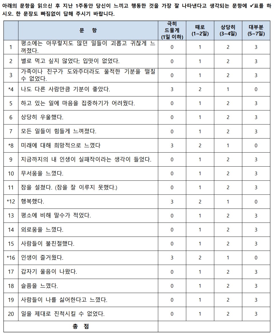 CES-D 척도는 20개의 문항으로 구성되어 있으며, 지난 1주일 동안 얼마나 자주 다음과 같은 증상을 경험했는지에 대해 답변합니다. 각 문항에 대해 점수를 매기고, 총점을 계산합니다. 총점이 16점 이상이면 우울증의 가능성이 있으므로, 전문가와 상담하는 것이 좋습니다. CES-D 척도의 자세한 내용과 문항은 다음과 같습니다.
