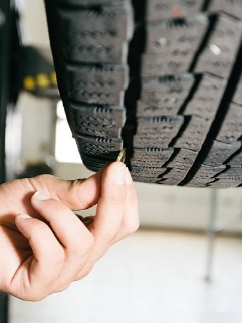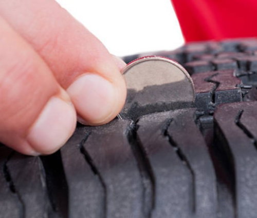 트레드의 깊이를 측정하는 방법은 여러 가지가 있습니다. 가장 일반적인 방법은 백원짜리 동전을 이용하는 것입니다. 백원짜리 동전을 거꾸로 해서 이순신 장군의 얼굴이 보이도록 트레드 중앙에 끼워 넣습니다. 이순신 장군의 감투가 거의 다 보인다면 즉시 타이어를 교체하세요. 이순신 장군의 감투가 약간만 보인다면, 타이어를 사러갈 시간입니다. 이순신 장군의 감투가 보이지 않는다면 (동전이 거의 이순신 장군 이마 부분까지 충분히 깊이 들어간다면), 아직 타이어를 교체할 때가 아닙니다.